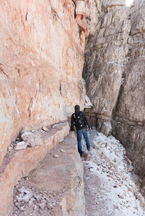 We spent our first full day in the Dolomites hiking at Tre Cime di Lavaredo. The loop around the peaks is a relatively easy 6 miles. There was snow on the ground, which made for a pretty hike, with only one small icy section, where I managed to slip, even with hiking poles. And there may have been a few tears halfway through the hike, not from falling, but from realizing I had lost the tripod mount that attaches to the camera (on the very first day of our trip). I likely dropped it less than a mile into the hike, so we weren't about to backtrack to try to find it.